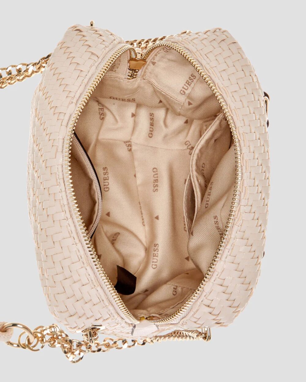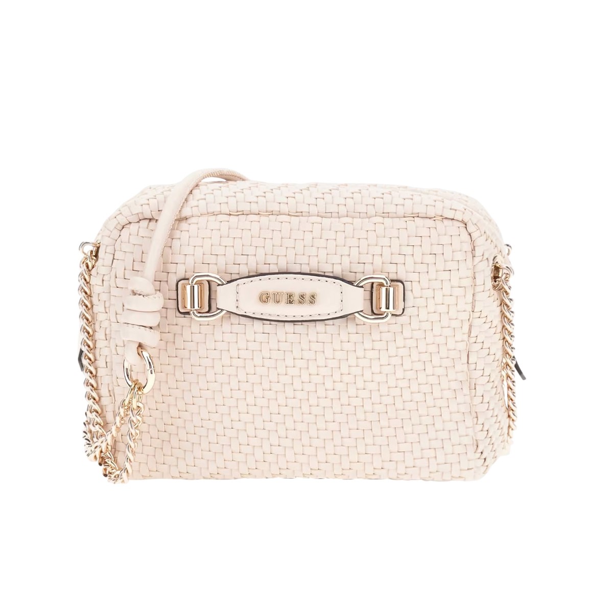 offers a stylish touch with its shiny gold hardware. Designed with a practical zip-around closure and a chain and leatherette strap,