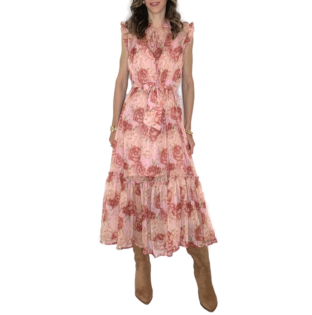 Ρομαντικό floral μακρύ φόρεμα σε απαλές ροζ και σομόν αποχρώσεις. Αέρινη γραμμή με ρομαντικά βολάν (ruffles) στους ώμους και στο κάτω μέρος. Διαθέτει ψηλό λαιμό με δέσιμο (κορδόνι) και συνοδεύεται από υφασμάτινη ζώνη στη μέση για να τονίζει τη σιλουέτα. Ημιδιάφανη υφή, ενώ περιλαμβάνει εσωτερική φόδρα (μεσοφόρι) για κάλυψη.