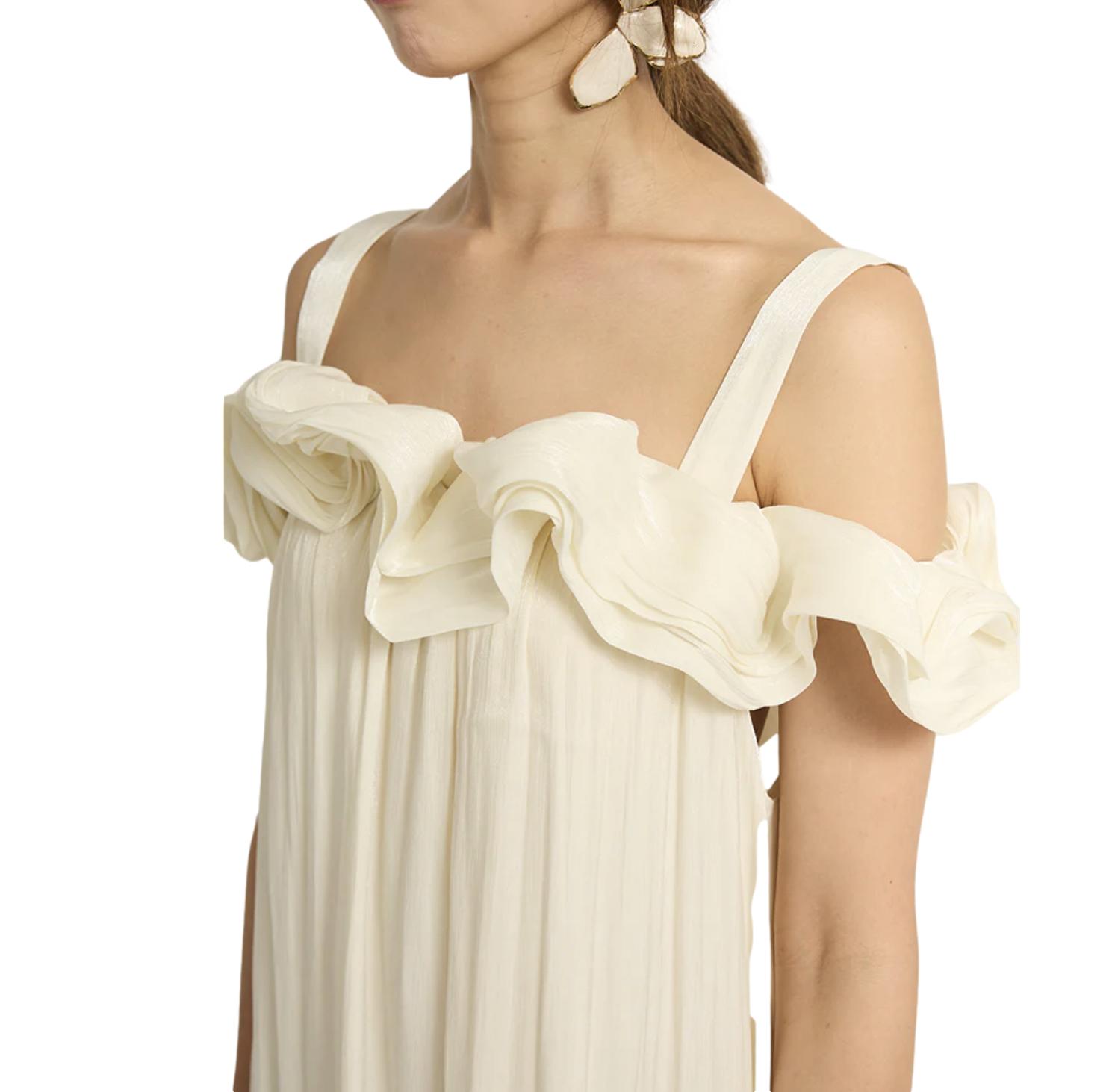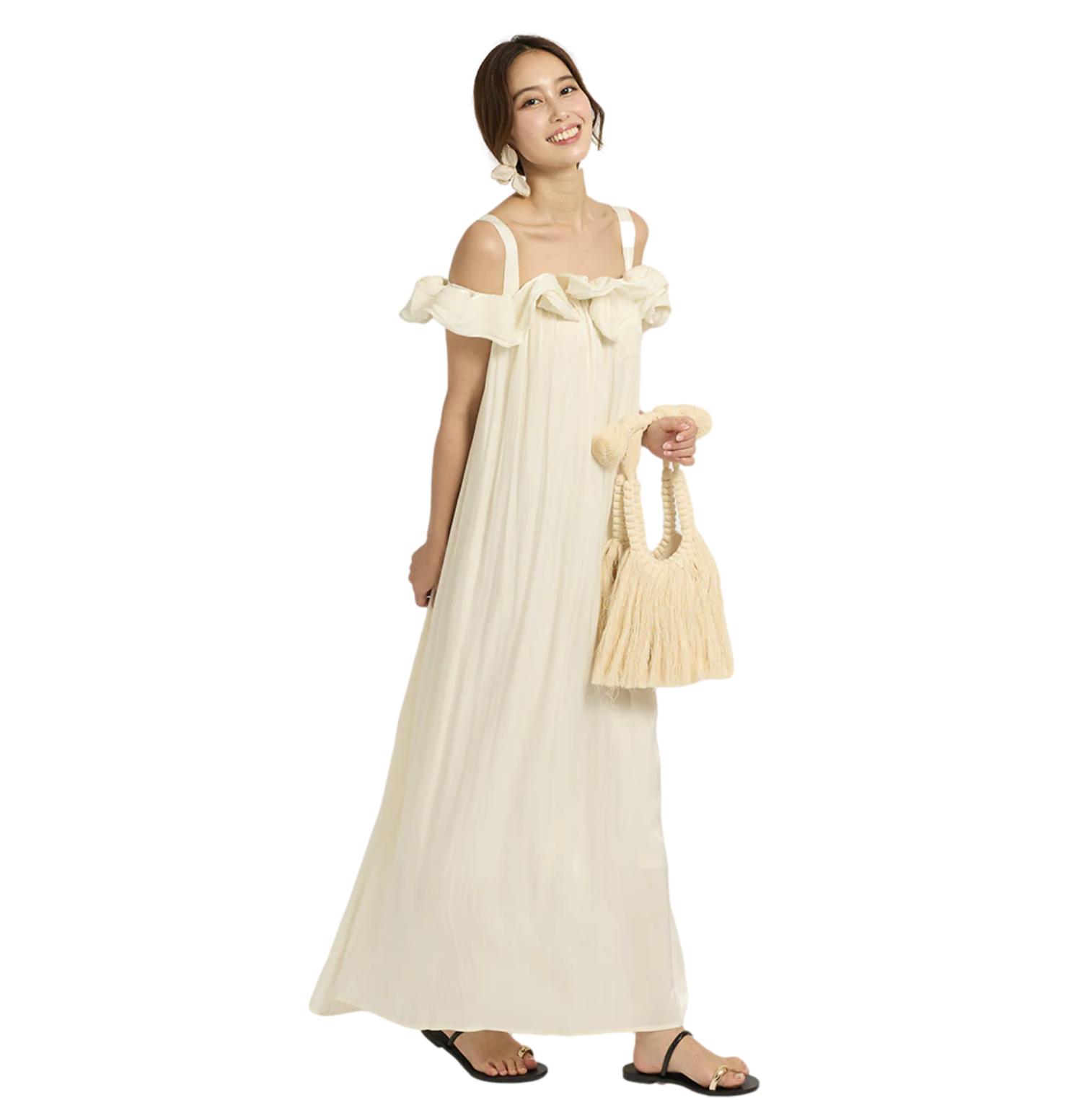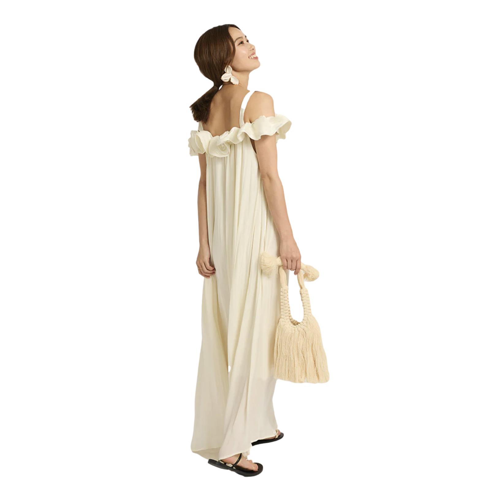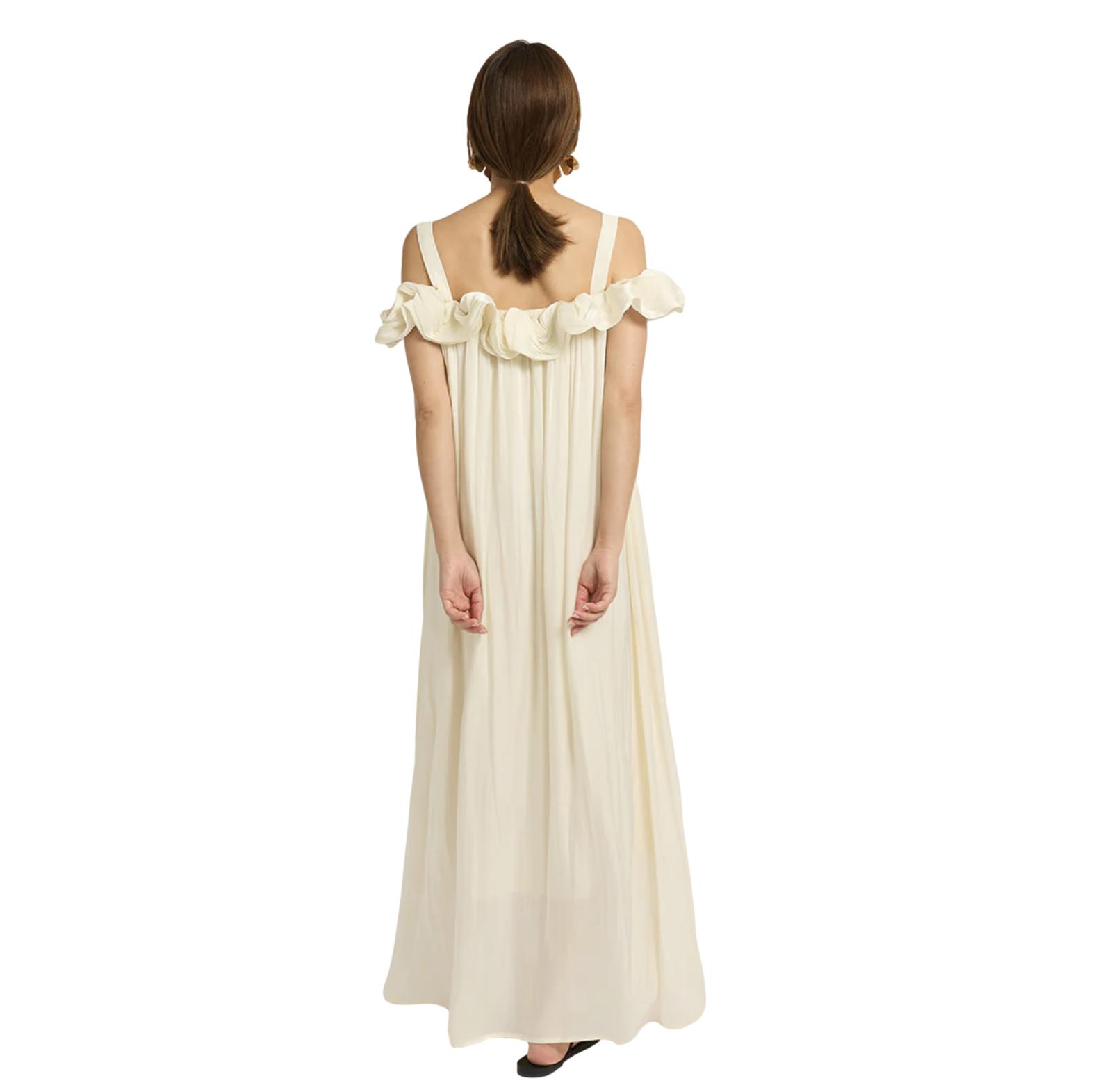 φόρεμα maxi με βολάν off-shoulder σε άνετη γραμμή. Αέρινο ελαφρύ ύφασμα σε κρέμ απόχρωση
