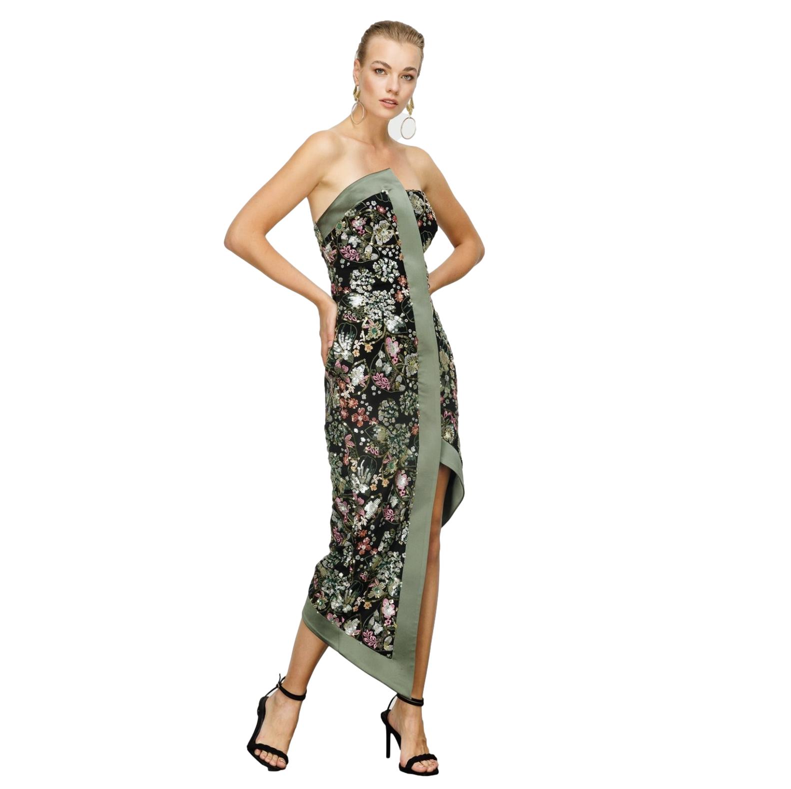 Φόρεμα midi strapless με εφαρμοστή γραμμή, floral κεντημένο μοτίβο σε σκούρο φόντο. Διαθέτει ασύμμετρο τελείωμα με διακριτικό άνοιγμα στο μπροστινό μέρος, κλείσιμο με κρυφό φερμουάρ στο πίσω μέρος.