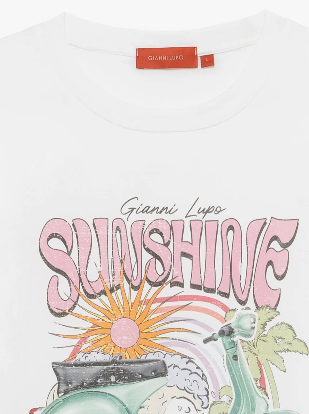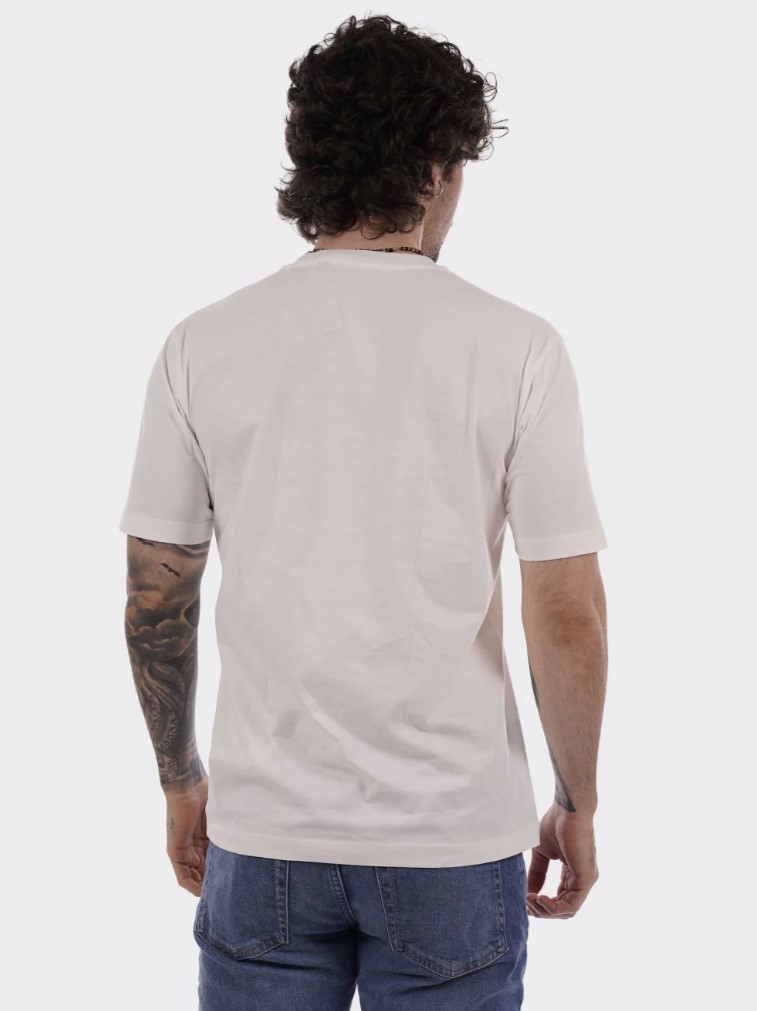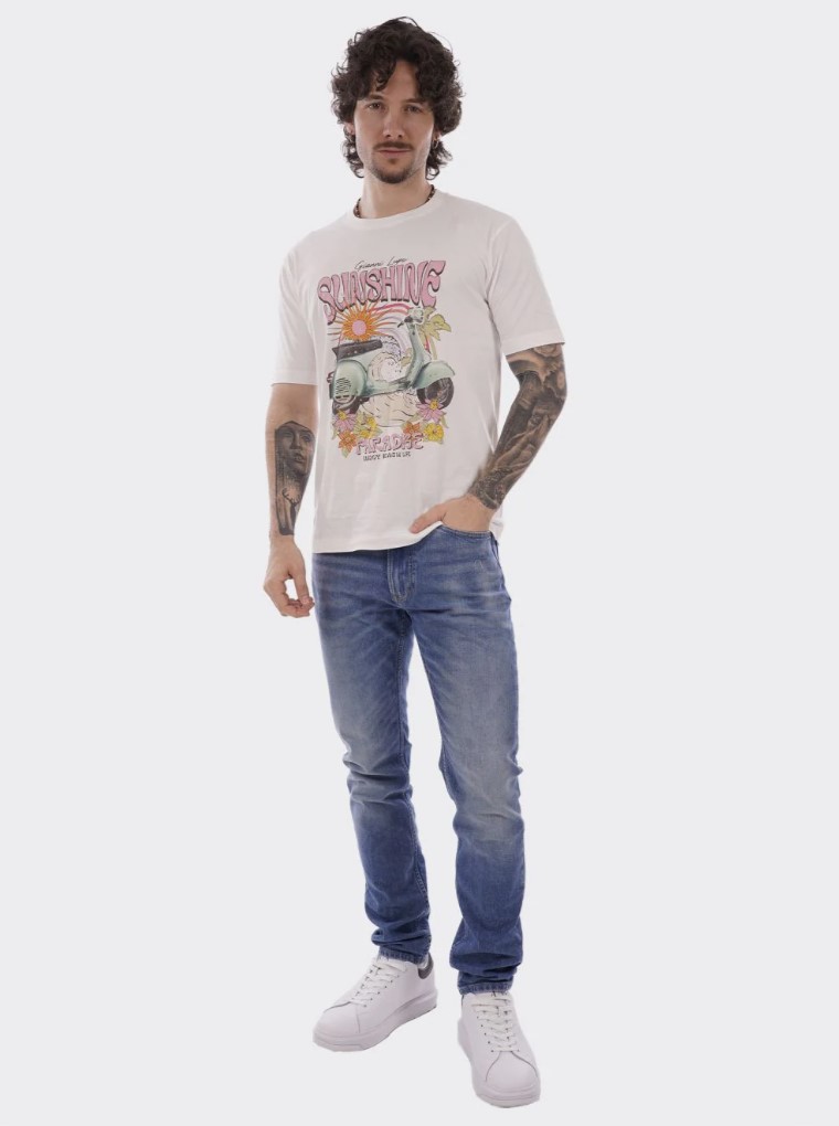 ανδρικό λευκό t-shirt με στάμπα Vespa, κατασκευασμένο από 100% βαμβάκι. Χαρακτηρίζεται από κανονική γραμμή (regular fit), λαιμόκοψη και vintage αισθητική